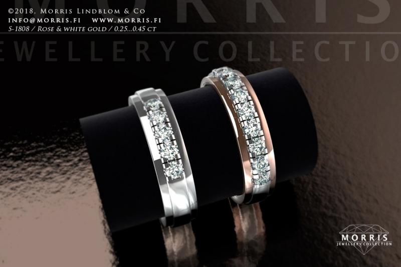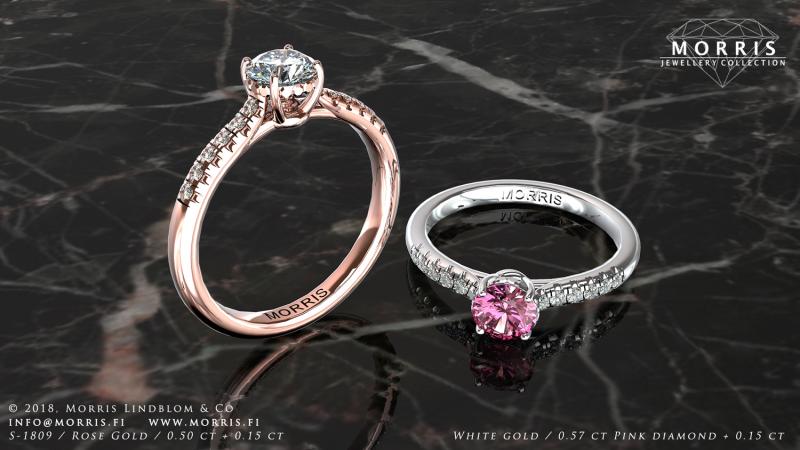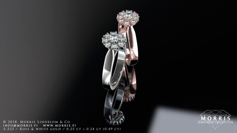 Timantit ja jalokivet: 0.25 ct + 8 x 0.025 ct, yht. 0.49 ct, toteutettavissa myös värijalokivin