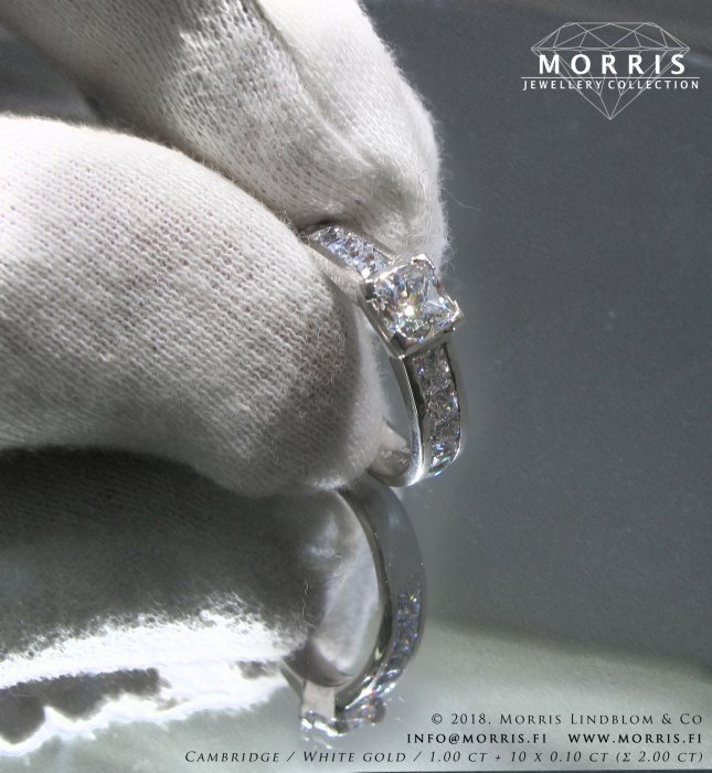 Selkeät ja puhtaat muodot, jäätävän upea karaatin timantti ja kymmenen näyttävää princess-hiottua timanttia jämäkässä sormusrungossa. Cambridge on elegantti ja tyrmäävän upea sormus hänelle, joka ei jaksa pitsimäistä näpertelyä, siirapsia koukeroita, outoja värikiviä, mitään väkinästä trendipelleilyä, vaan jotain ajatonta, kestävää ja, ennen kaikkea, isot häikäisevät timantit!